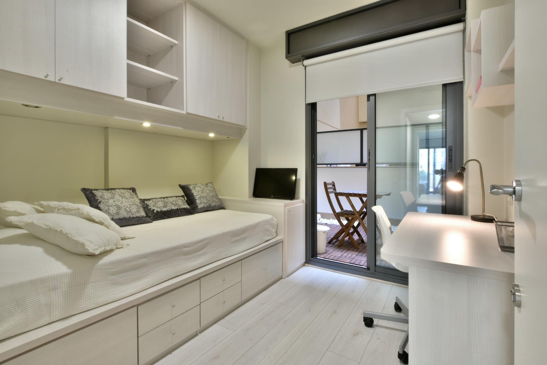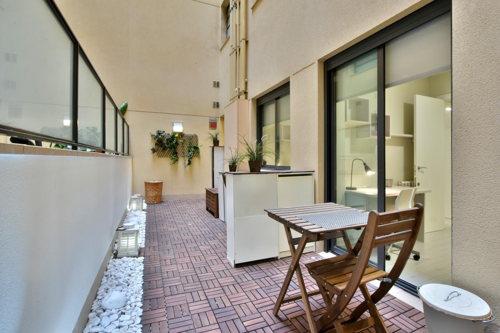 two medium-sized bedrooms sharing a bathroom with shower, one of which has direct access to a 16 m² interior terrace, decorated as a chill-out area;