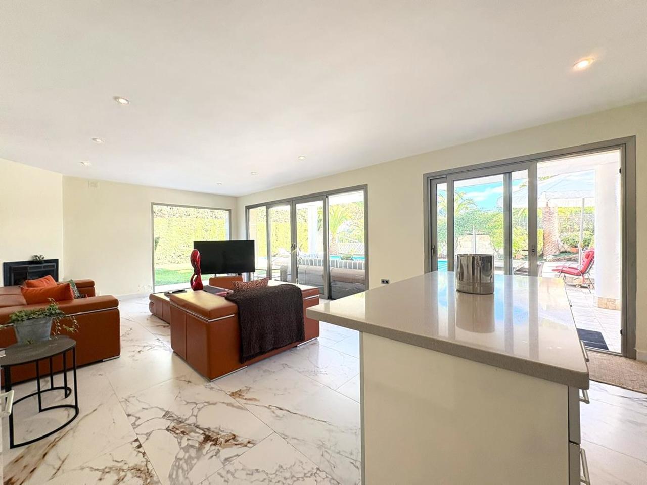 Large living room with open-plan kitchen and garden room overlooking the pool