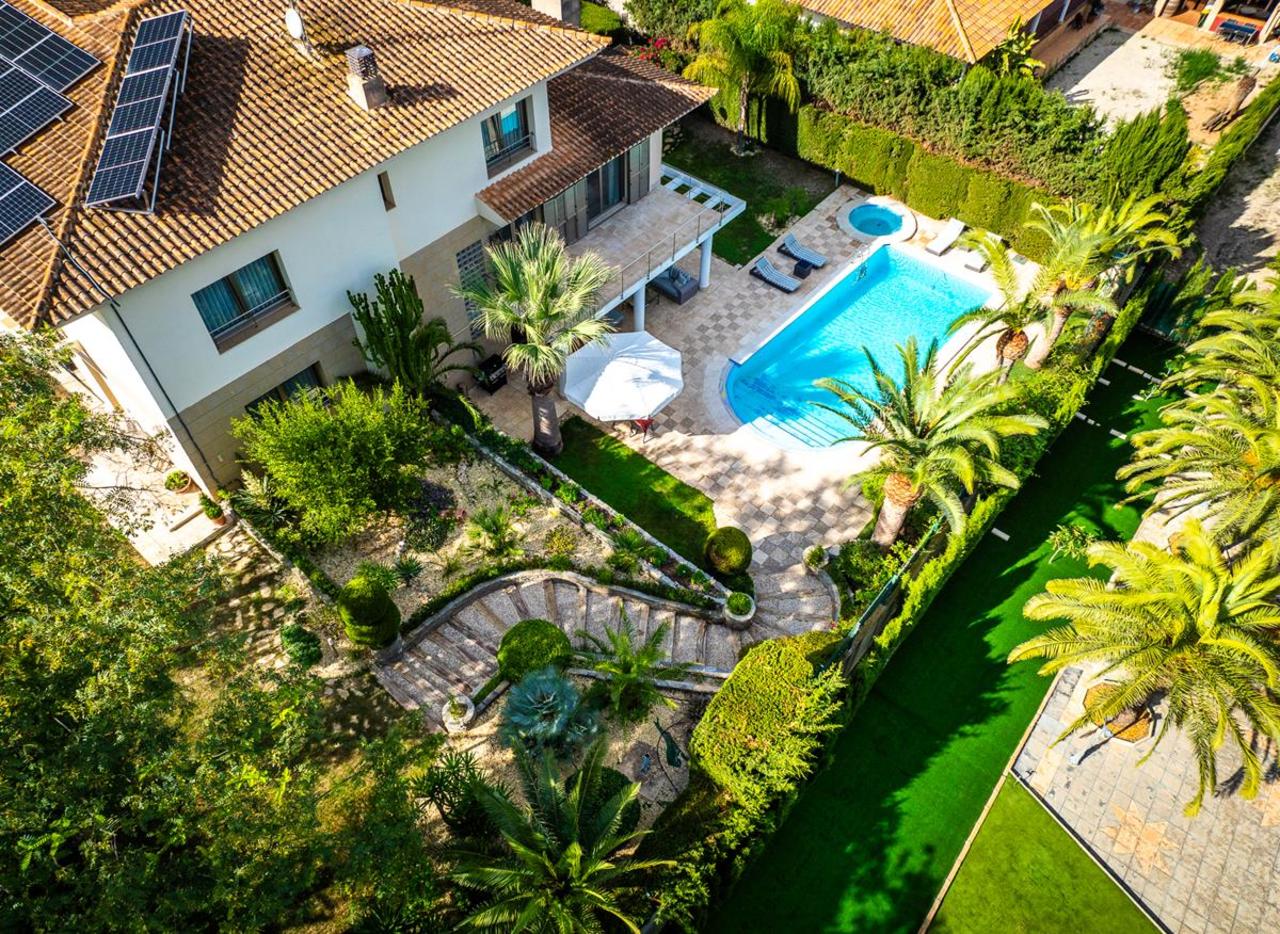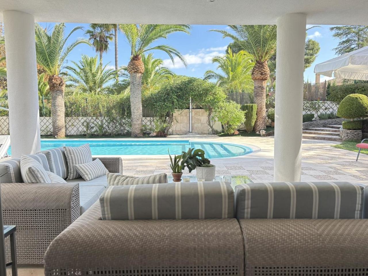 Set on a 1,800 m² plot, the property is surrounded by meticulously landscaped gardens featuring mature pine and palm trees, natural lawns, and Mediterranean vegetation, ensuring privacy and tranquility year-round. The outdoor area is organized around a 12 x 5 meter infinity pool with an integrated spa, surrounded by elegant terraces ideal for relaxing or entertaining. For added convenience, there are also outdoor changing rooms with a shower and toilet.